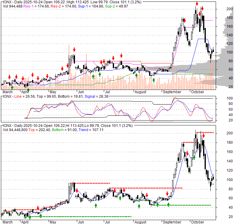 Price has closed above its short-term moving average. Short-term moving average is currently below mid-term; and above long-term moving average. From the relationship between price and moving averages: This stock is NEUTRAL in short-term; and NEUTRAL in mid-long term.[ IONX ] has closed above bottom band by 25.5%. Bollinger Bands are 181.8% wider than normal. The large width of the bands suggest high volatility as compared to its normal range. The bands have been in this wide range for 30 days. This is a sign that the current trend might continue.