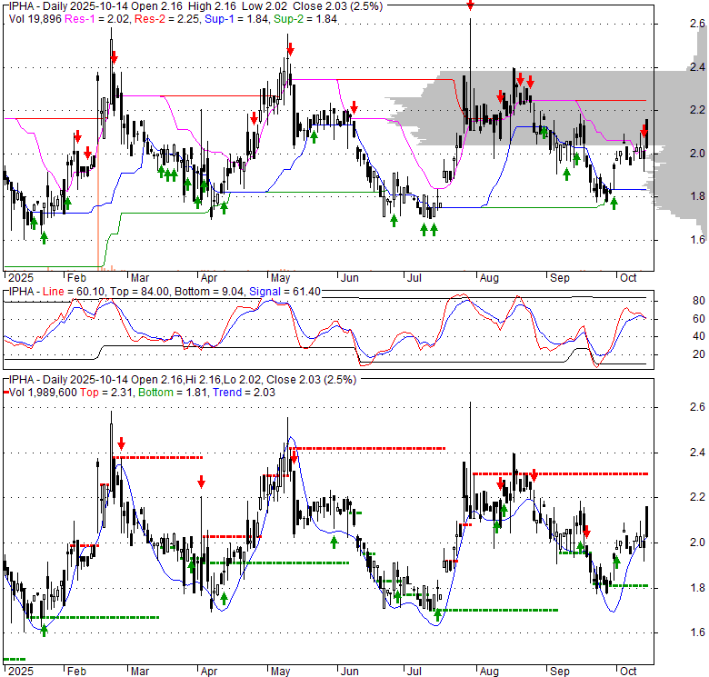 Price has closed above its short-term moving average. Short-term moving average is currently below mid-term; and above long-term moving average. From the relationship between price and moving averages: This stock is NEUTRAL in short-term; and NEUTRAL in mid-long term.[ IPHA ] has closed below upper band by 8.7%. Bollinger Bands are 11.3% wider than normal. The current width of the bands does not suggest anything about the future direction or movement of prices.