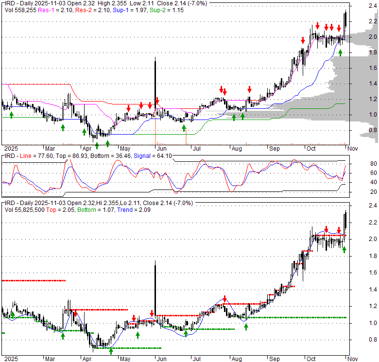 Price has closed above its short-term moving average. Short-term moving average is currently above mid-term; and above long-term moving average. From the relationship between price and moving averages: This stock is BULLISH in short-term; and BULLISH in mid-long term.[ IRD ] has closed below upper band by 14.3%. Bollinger Bands are 31.3% wider than normal. The current width of the bands does not suggest anything about the future direction or movement of prices.