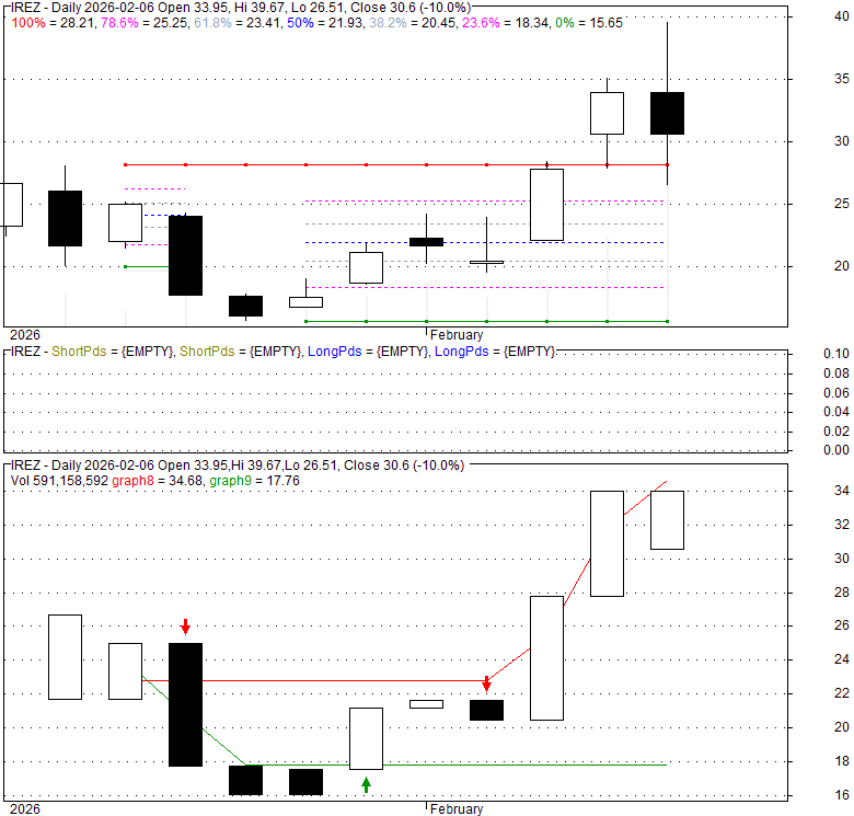 Price has closed above its short-term moving average. Short-term moving average is currently below mid-term; and below long-term moving average. From the relationship between price and moving averages: This stock is NEUTRAL in short-term; and NEUTRAL in mid-long term.[ IREZ ] has closed Bollinger Bands are 0% narrower than normal.