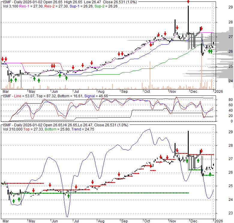 Price has closed above its short-term moving average. Short-term moving average is currently below mid-term; and below long-term moving average. From the relationship between price and moving averages: This stock is NEUTRAL in short-term; and NEUTRAL in mid-long term.[ ISMF ] has closed below upper band by 44.5%. Bollinger Bands are 132.1% wider than normal. The large width of the bands suggest high volatility as compared to its normal range. The bands have been in this wide range for 11 days. This is a sign that the current trend might continue.