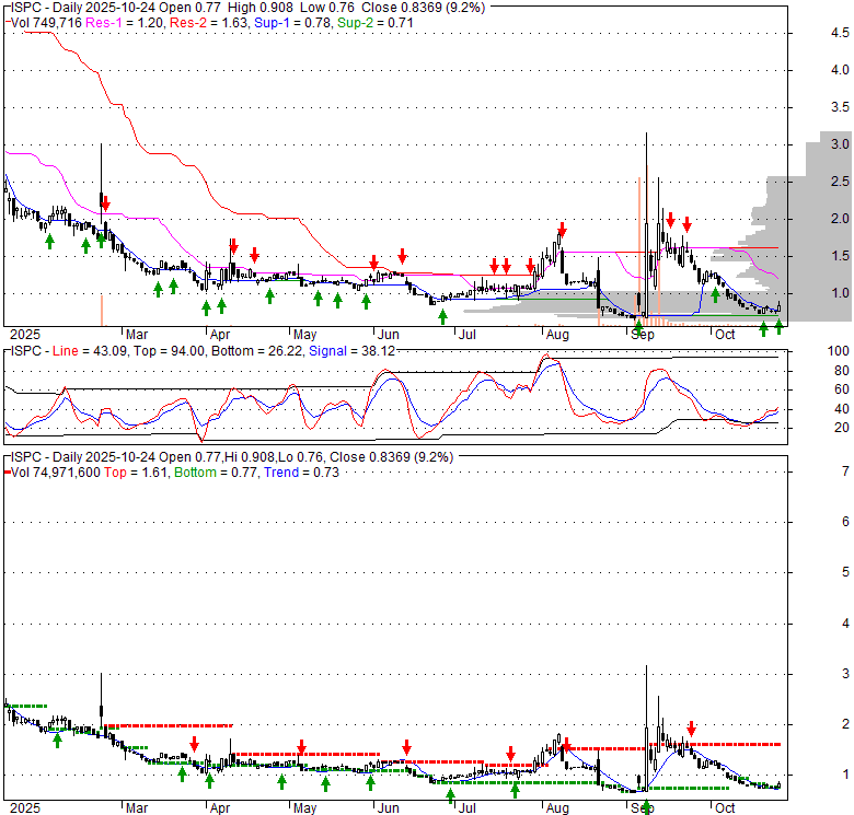 Price has closed above its short-term moving average. Short-term moving average is currently below mid-term; and below long-term moving average. From the relationship between price and moving averages: This stock is NEUTRAL in short-term; and BEARISH in mid-long term.[ ISPC ] has closed above bottom band by 44.3%. Bollinger Bands are 46.3% narrower than normal. The narrow width of the bands suggests low volatility as compared to its normal range. The bands have been in this narrow range for 0 bars. This is a sign that the market may be about to initiate a new trend.