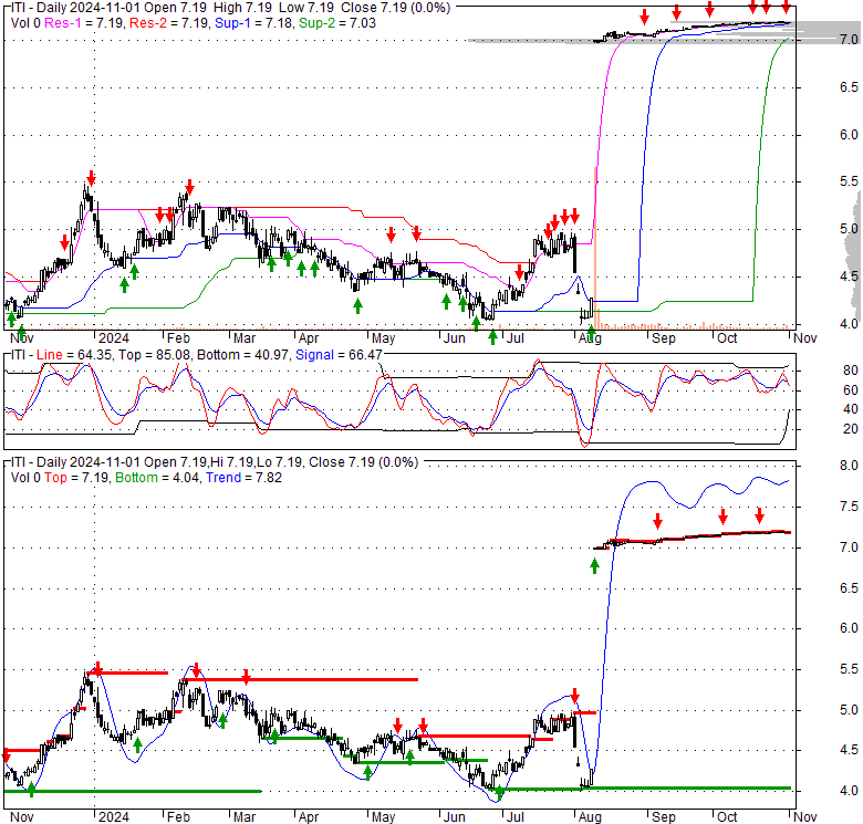 Price has closed below its short-term moving average. Short-term moving average is currently above mid-term; and above long-term moving average. From the relationship between price and moving averages: This stock is NEUTRAL in short-term; and BULLISH in mid-long term.[ ITI ] has closed below upper band by 44.6%. Bollinger Bands are 97.3% narrower than normal. The narrow width of the bands suggests low volatility as compared to its normal range. The bands have been in this narrow range for 45 bars. This is a sign that the market may be about to initiate a new trend.