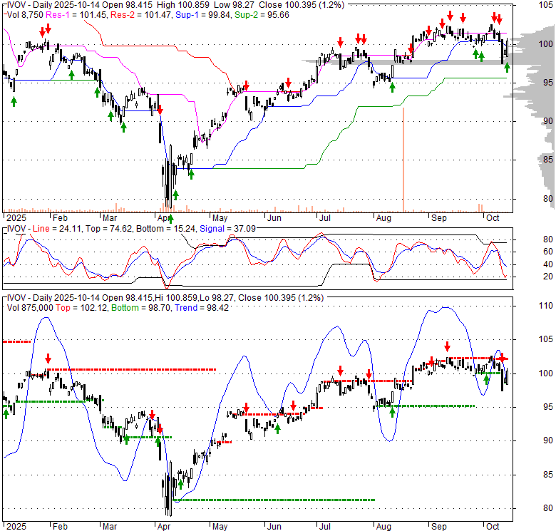 Price has closed above its short-term moving average. Short-term moving average is currently below mid-term; and above long-term moving average. From the relationship between price and moving averages: This stock is NEUTRAL in short-term; and NEUTRAL in mid-long term.[ IVOV ] has closed above bottom band by 46.5%. Bollinger Bands are 6.4% narrower than normal. The current width of the bands does not suggest anything about the future direction or movement of prices.