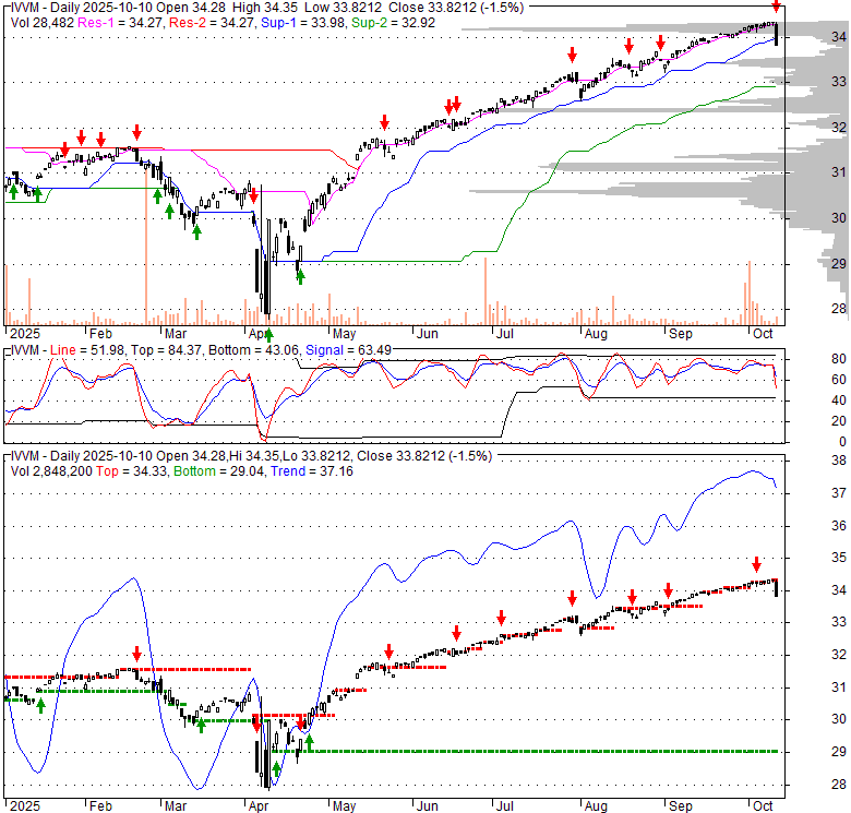 Price has closed below its short-term moving average. Short-term moving average is currently above mid-term; and above long-term moving average. From the relationship between price and moving averages: This stock is NEUTRAL in short-term; and BULLISH in mid-long term.[ IVVM ] has closed below the lower bollinger band by 14.0%. If price is in a downtrend band; this downward trend might continue. However a short term pullback inside the band is likely. Bollinger Bands are 22.8% narrower than normal. The current width of the bands does not suggest anything about the future direction or movement of prices.