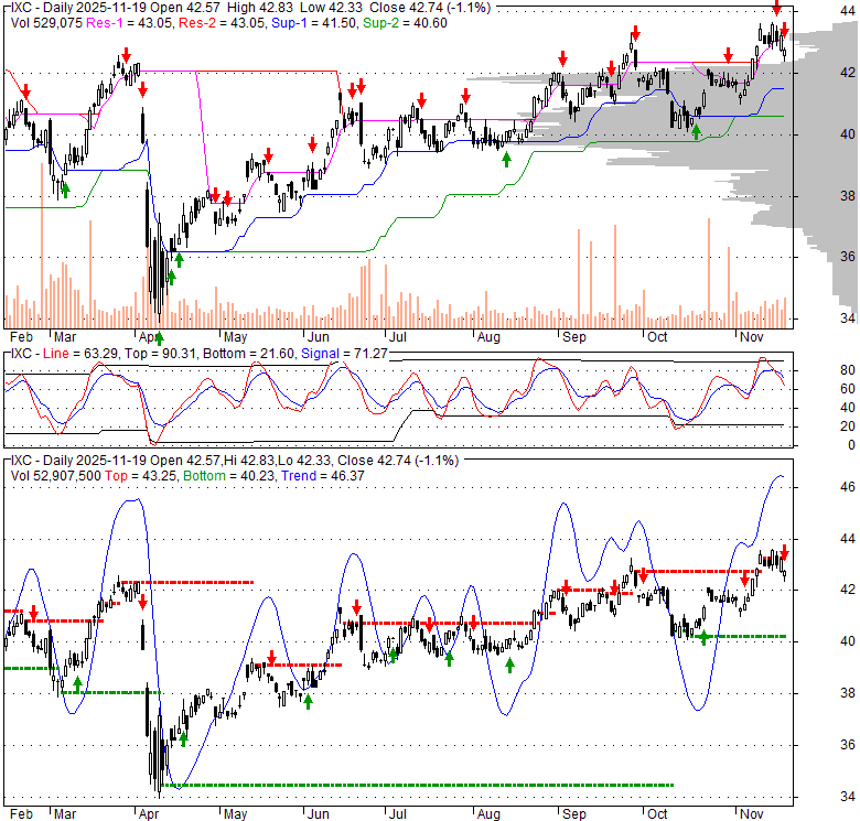 Price has closed below its short-term moving average. Short-term moving average is currently above mid-term; and above long-term moving average. From the relationship between price and moving averages: This stock is NEUTRAL in short-term; and BULLISH in mid-long term.[ IXC ] has closed below upper band by 39.9%. Bollinger Bands are 45.7% wider than normal. The large width of the bands suggest high volatility as compared to its normal range. The bands have been in this wide range for 3 days. This is a sign that the current trend might continue.