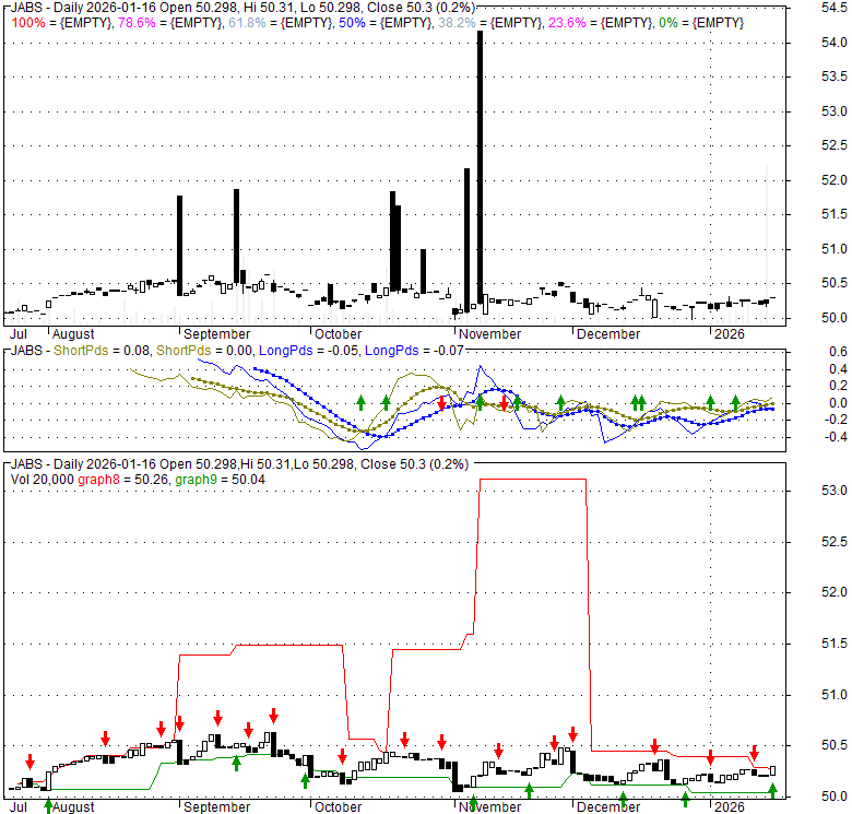 Price has closed above its short-term moving average. Short-term moving average is currently below mid-term; and below long-term moving average. From the relationship between price and moving averages: This stock is NEUTRAL in short-term; and BEARISH in mid-long term.[ JABS ] has closed It is unclear right now based on current values. 48.2% narrower than normal. The narrow width of the bands suggests low volatility as compared to its normal range. The bands have been in this narrow range for 3 bars. This is a sign that the market may be about to initiate a new trend.