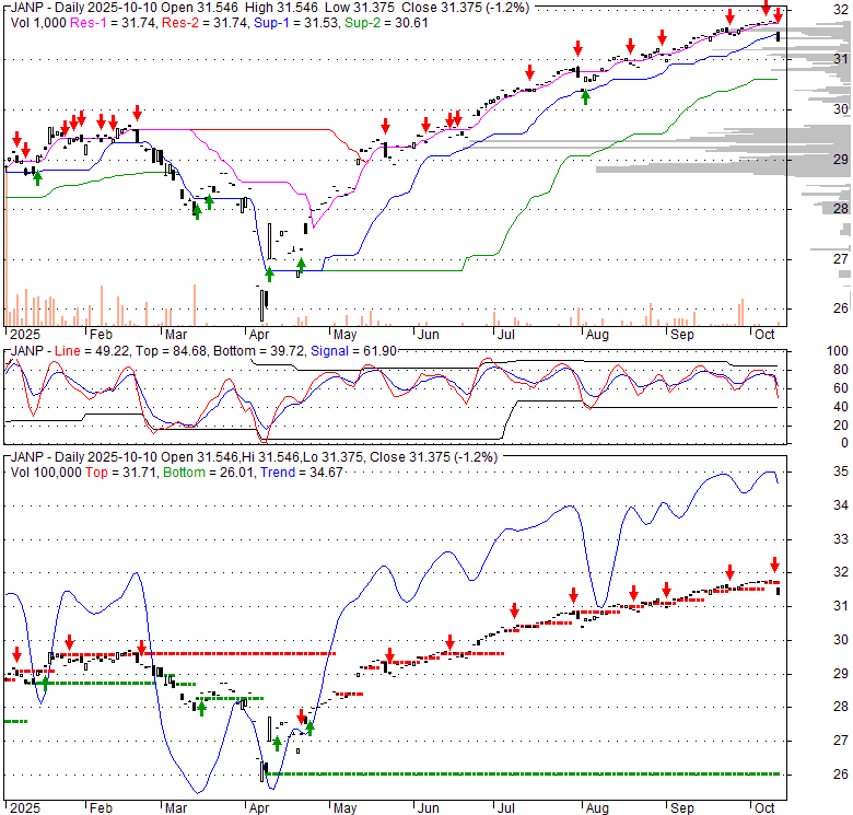 Price has closed below its short-term moving average. Short-term moving average is currently above mid-term; and above long-term moving average. From the relationship between price and moving averages: This stock is NEUTRAL in short-term; and BULLISH in mid-long term.[ JANP ] has closed below the lower bollinger band by 12.5%. If price is in a downtrend band; this downward trend might continue. However a short term pullback inside the band is likely. Bollinger Bands are 38.3% narrower than normal. The current width of the bands does not suggest anything about the future direction or movement of prices.