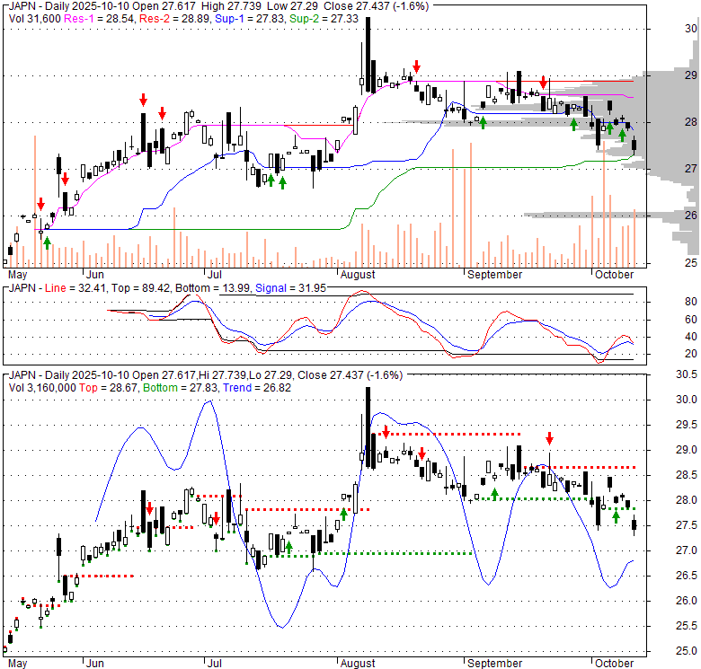 Price has closed below its short-term moving average. Short-term moving average is currently below mid-term; and above long-term moving average. From the relationship between price and moving averages: This stock is BEARISH in short-term; and NEUTRAL in mid-long term.[ JAPN ] has closed below the lower bollinger band by 3.0%. If price is in a downtrend band; this downward trend might continue. However a short term pullback inside the band is likely. Bollinger Bands are 0% narrower than normal.