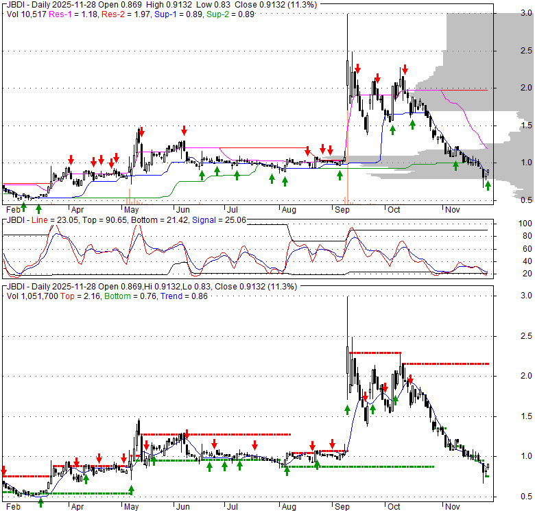 Price has closed above its short-term moving average. Short-term moving average is currently below mid-term; and below long-term moving average. From the relationship between price and moving averages: This stock is NEUTRAL in short-term; and NEUTRAL in mid-long term.[ JBDI ] has closed above bottom band by 28.9%. Bollinger Bands are 25.3% narrower than normal. The current width of the bands does not suggest anything about the future direction or movement of prices.
