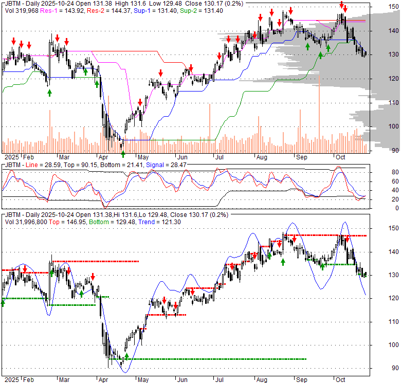 Price has closed below its short-term moving average. Short-term moving average is currently below mid-term; and below long-term moving average. From the relationship between price and moving averages: This stock is BEARISH in short-term; and NEUTRAL in mid-long term.[ JBTM ] has closed above bottom band by 16.5%. Bollinger Bands are 80% wider than normal. The large width of the bands suggest high volatility as compared to its normal range. The bands have been in this wide range for 3 days. This is a sign that the current trend might continue.