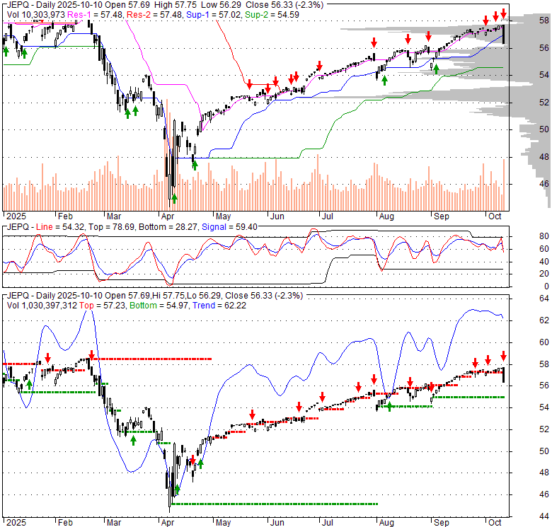 Price has closed below its short-term moving average. Short-term moving average is currently above mid-term; and above long-term moving average. From the relationship between price and moving averages: This stock is NEUTRAL in short-term; and BULLISH in mid-long term.[ JEPQ ] has closed below the lower bollinger band by 23.1%. Bollinger Bands are 32.3% narrower than normal. The current width of the bands does not suggest anything about the future direction or movement of prices.