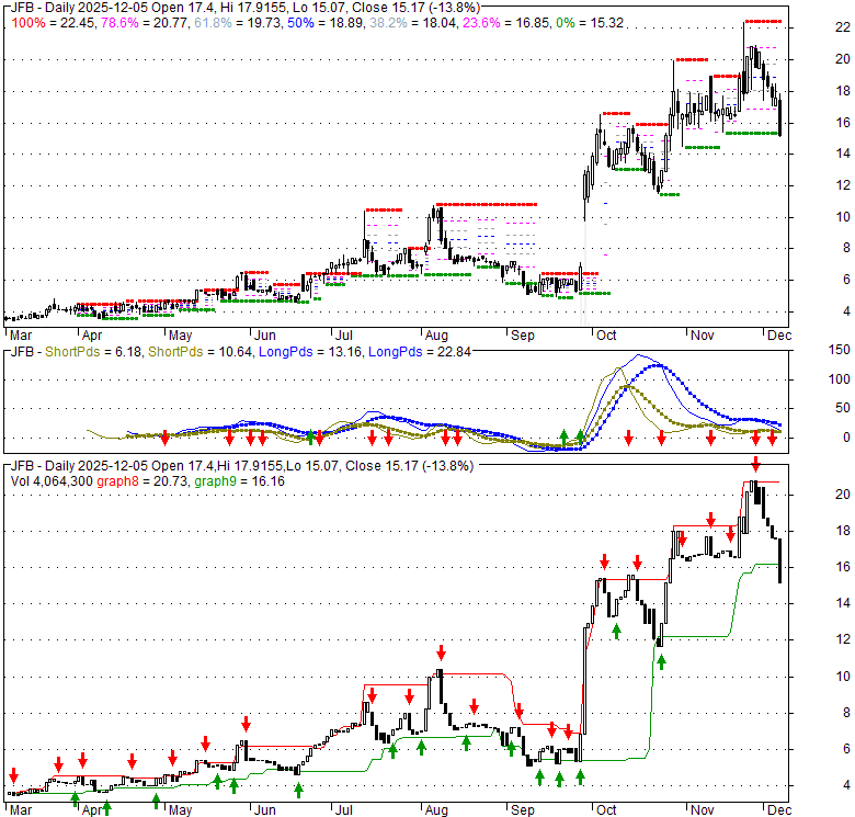 Price has closed below its short-term moving average. Short-term moving average is currently above mid-term; and above long-term moving average. From the relationship between price and moving averages: This stock is NEUTRAL in short-term; and BULLISH in mid-long term.[ JFB ] has closed above bottom band by 2.5%. Bollinger Bands are 20.8% wider than normal. The current width of the bands does not suggest anything about the future direction or movement of prices.