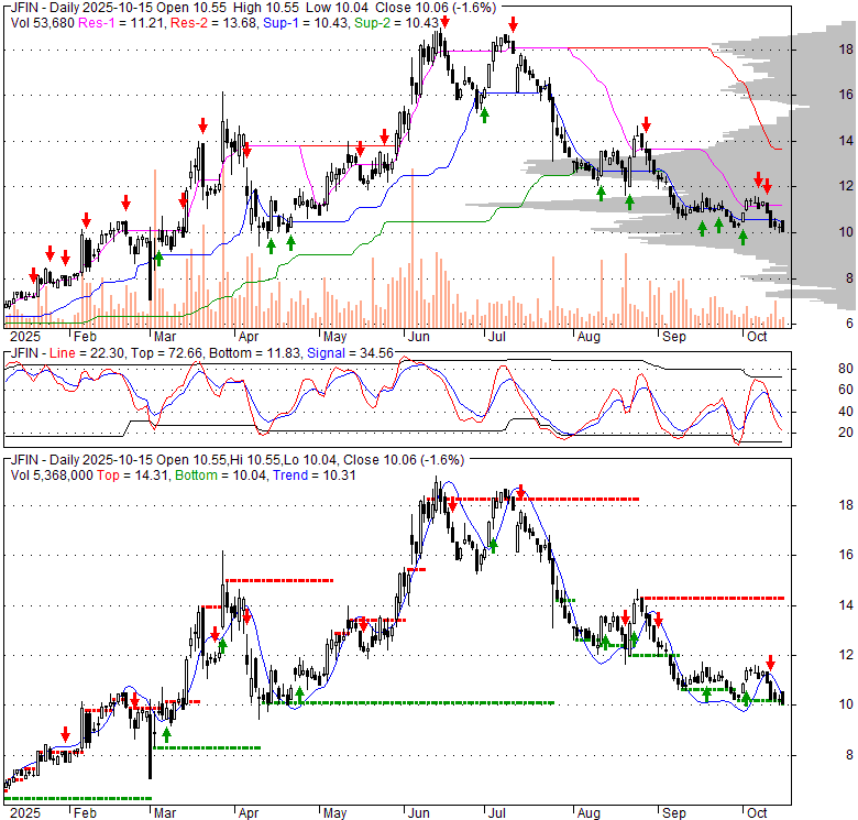 Price has closed below its short-term moving average. Short-term moving average is currently below mid-term; and below long-term moving average. From the relationship between price and moving averages: This stock is BEARISH in short-term; and BEARISH in mid-long term.[ JFIN ] has closed above bottom band by 19.8%. Bollinger Bands are 49.2% narrower than normal. The narrow width of the bands suggests low volatility as compared to its normal range. The bands have been in this narrow range for 17 bars. This is a sign that the market may be about to initiate a new trend.