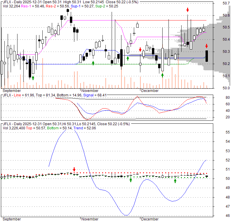 Price has closed below its short-term moving average. Short-term moving average is currently above mid-term; and below long-term moving average. From the relationship between price and moving averages: This stock is NEUTRAL in short-term; and NEUTRAL in mid-long term.[ JFLX ] has closed above bottom band by 14.5%. Bollinger Bands are 0% narrower than normal.