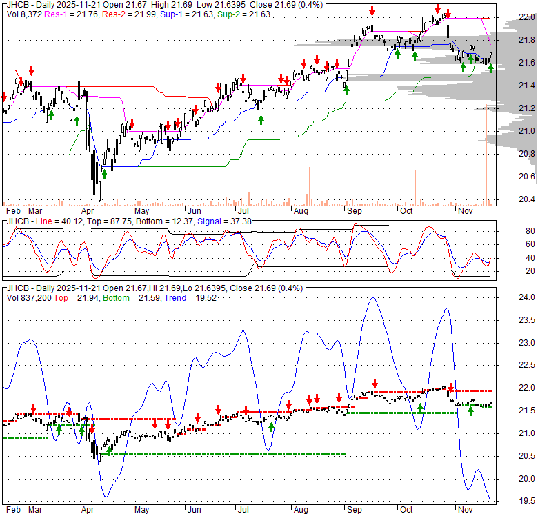 Price has closed above its short-term moving average. Short-term moving average is currently below mid-term; and below long-term moving average. From the relationship between price and moving averages: This stock is NEUTRAL in short-term; and NEUTRAL in mid-long term.[ JHCB ] has closed below upper band by 31.8%. Bollinger Bands are 38.7% narrower than normal. The current width of the bands does not suggest anything about the future direction or movement of prices.