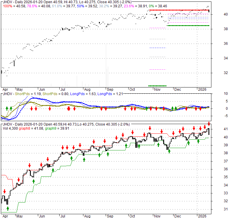 Price has closed below its short-term moving average. Short-term moving average is currently above mid-term; and above long-term moving average. From the relationship between price and moving averages: This stock is NEUTRAL in short-term; and BULLISH in mid-long term.[ JHDV ] has closed above bottom band by 41.1%. Bollinger Bands are 5% wider than normal. The current width of the bands does not suggest anything about the future direction or movement of prices.