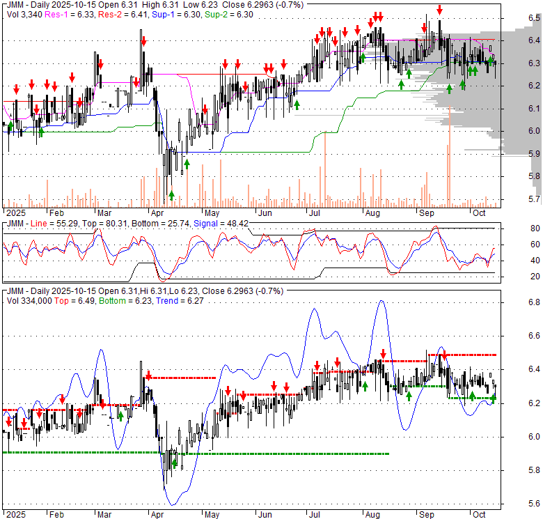 Price has closed above its short-term moving average. Short-term moving average is currently below mid-term; and above long-term moving average. From the relationship between price and moving averages: This stock is NEUTRAL in short-term; and NEUTRAL in mid-long term.[ JMM ] has closed below upper band by 35.0%. Bollinger Bands are 23.3% narrower than normal. The current width of the bands does not suggest anything about the future direction or movement of prices.