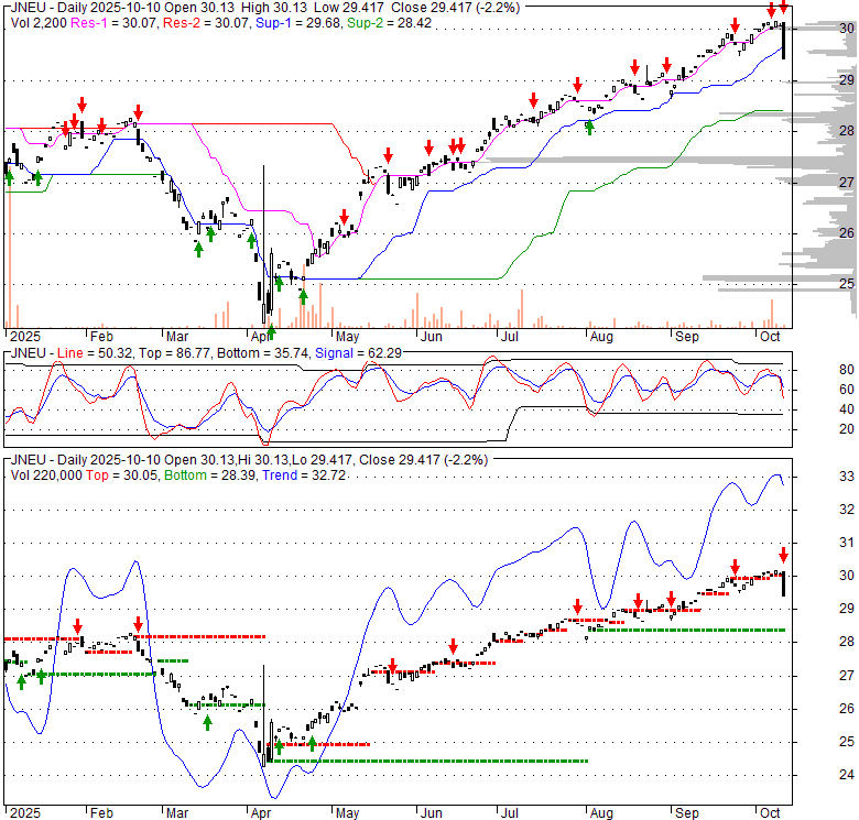 Price has closed below its short-term moving average. Short-term moving average is currently above mid-term; and above long-term moving average. From the relationship between price and moving averages: This stock is NEUTRAL in short-term; and BULLISH in mid-long term.[ JNEU ] has closed below the lower bollinger band by 6.3%. Although price has broken the lower band and a downside breakout is possible; the most likely direction for [ JNEU ] is to continue within current trading range. Bollinger Bands are 5.5% narrower than normal. The current width of the bands does not suggest anything about the future direction or movement of prices.