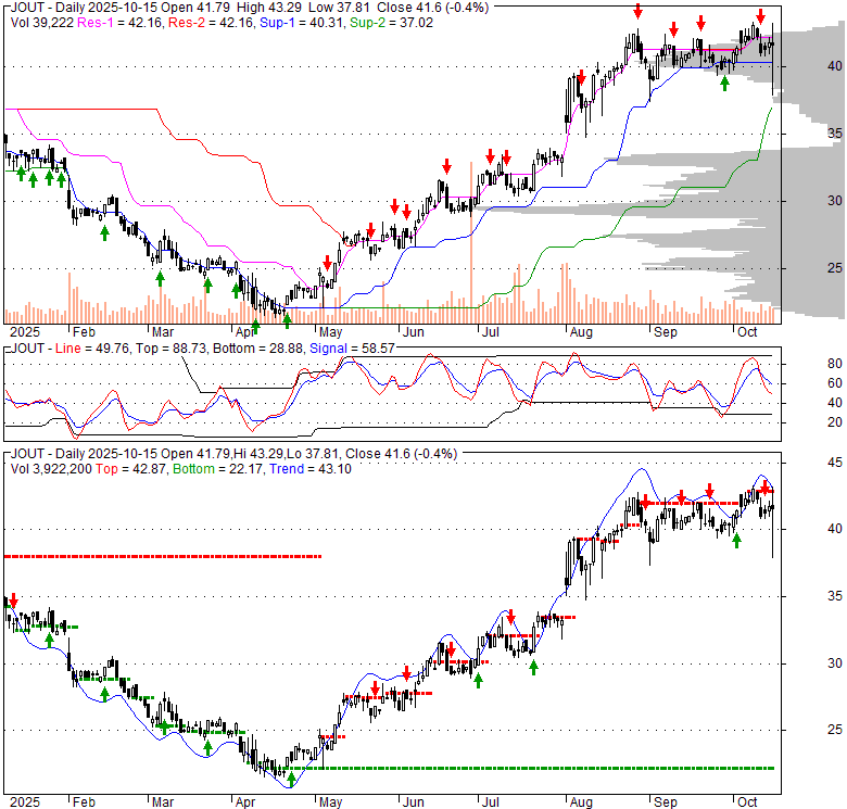 Price has closed above its short-term moving average. Short-term moving average is currently above mid-term; and above long-term moving average. From the relationship between price and moving averages: This stock is BULLISH in short-term; and BULLISH in mid-long term.[ JOUT ] has closed below upper band by 42.6%. Bollinger Bands are 23.6% narrower than normal. The current width of the bands does not suggest anything about the future direction or movement of prices.