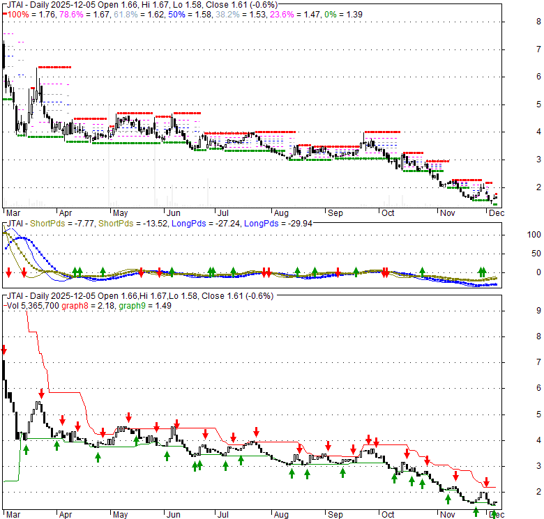 Price has closed above its short-term moving average. Short-term moving average is currently below mid-term; and below long-term moving average. From the relationship between price and moving averages: This stock is NEUTRAL in short-term; and BEARISH in mid-long term.[ JTAI ] has closed above bottom band by 33.2%. Bollinger Bands are 24.3% narrower than normal. The current width of the bands does not suggest anything about the future direction or movement of prices.