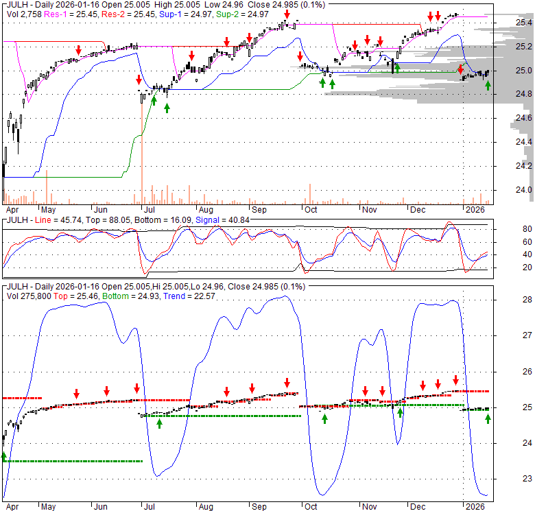 Price has closed above its short-term moving average. Short-term moving average is currently below mid-term; and below long-term moving average. From the relationship between price and moving averages: This stock is NEUTRAL in short-term; and NEUTRAL in mid-long term.[ JULH ] has closed above bottom band by 41.3%. Bollinger Bands are 125.7% wider than normal. The large width of the bands suggest high volatility as compared to its normal range. The bands have been in this wide range for 11 days. This is a sign that the current trend might continue.