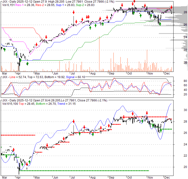 Price has closed below its short-term moving average. Short-term moving average is currently above mid-term; and above long-term moving average. From the relationship between price and moving averages: This stock is NEUTRAL in short-term; and BULLISH in mid-long term.[ JXX ] has closed above bottom band by 42.8%. Bollinger Bands are 46.6% wider than normal. The large width of the bands suggest high volatility as compared to its normal range. The bands have been in this wide range for 15 days. This is a sign that the current trend might continue.
