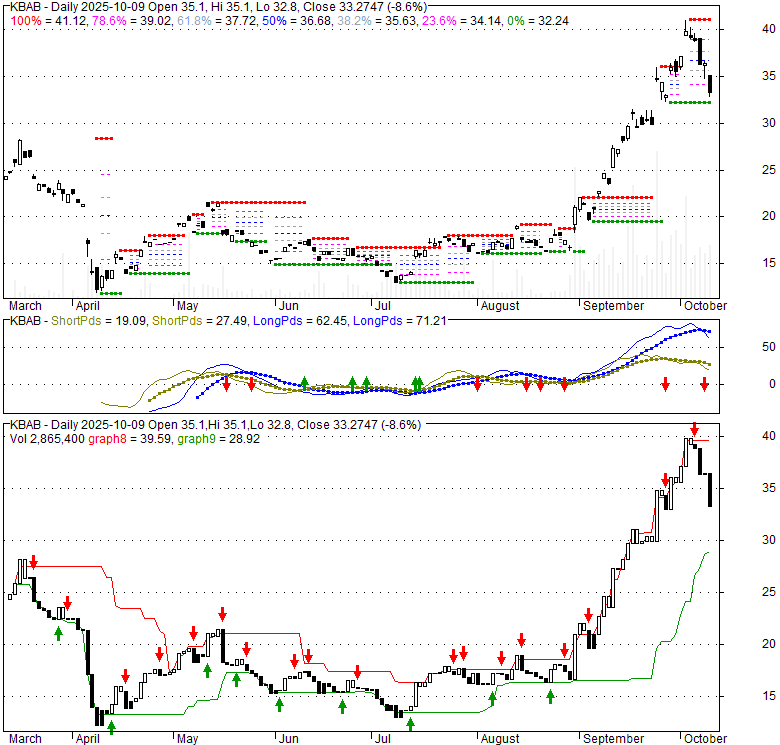 Price has closed below its short-term moving average. Short-term moving average is currently above mid-term; and above long-term moving average. From the relationship between price and moving averages: This stock is NEUTRAL in short-term; and BULLISH in mid-long term.[ KBAB ] has closed above bottom band by 34.3%. Bollinger Bands are 96.6% wider than normal. The large width of the bands suggest high volatility as compared to its normal range. The bands have been in this wide range for 24 days. This is a sign that the current trend might continue.