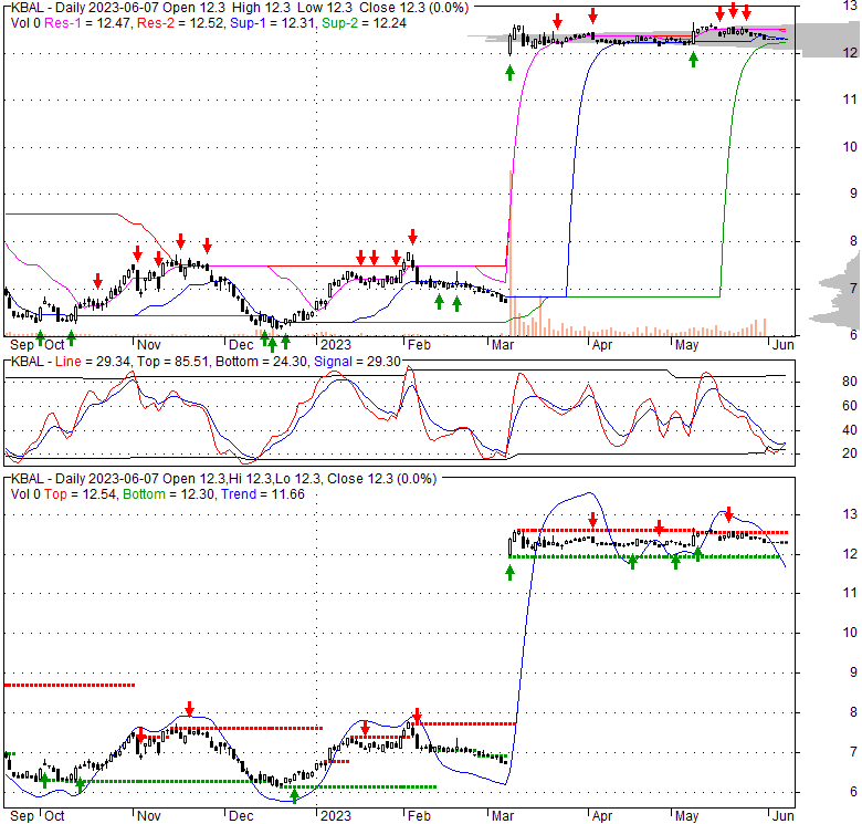 Price has closed below its short-term moving average. Short-term moving average is currently below mid-term; and above long-term moving average. From the relationship between price and moving averages: This stock is NEUTRAL in short-term; and NEUTRAL in mid-long term.[ KBAL ] has closed above bottom band by 22.5%. Bollinger Bands are 80.3% narrower than normal. The narrow width of the bands suggests low volatility as compared to its normal range. The bands have been in this narrow range for 49 bars. This is a sign that the market may be about to initiate a new trend.