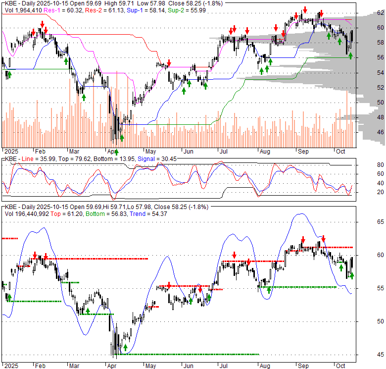 Price has closed above its short-term moving average. Short-term moving average is currently below mid-term; and above long-term moving average. From the relationship between price and moving averages: This stock is NEUTRAL in short-term; and NEUTRAL in mid-long term.[ KBE ] has closed above bottom band by 35.6%. Bollinger Bands are 7.2% narrower than normal. The current width of the bands does not suggest anything about the future direction or movement of prices.