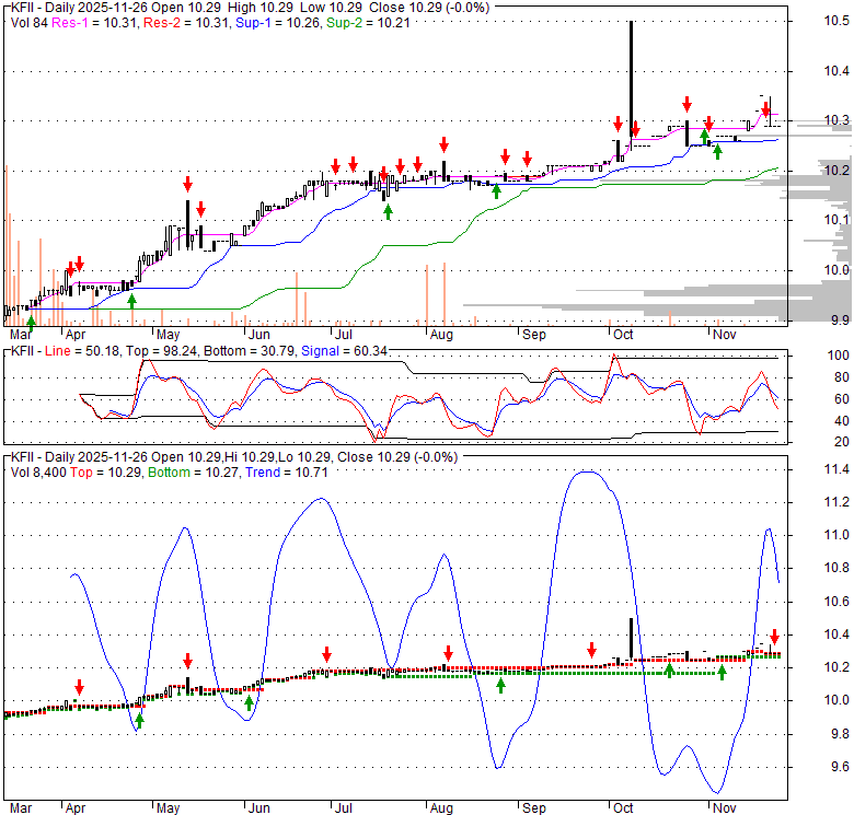 Price has closed below its short-term moving average. Short-term moving average is currently above mid-term; and above long-term moving average. From the relationship between price and moving averages: This stock is NEUTRAL in short-term; and BULLISH in mid-long term.[ KFII ] has closed below upper band by 47.8%. Bollinger Bands are 79.4% wider than normal. The large width of the bands suggest high volatility as compared to its normal range. The bands have been in this wide range for 7 days. This is a sign that the current trend might continue.