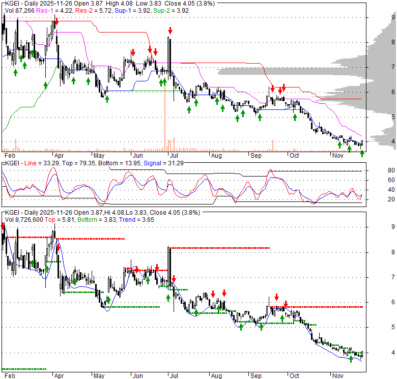 Price has closed above its short-term moving average. Short-term moving average is currently below mid-term; and below long-term moving average. From the relationship between price and moving averages: This stock is NEUTRAL in short-term; and BEARISH in mid-long term.[ KGEI ] has closed below upper band by 47.5%. Bollinger Bands are 52.5% narrower than normal. The narrow width of the bands suggests low volatility as compared to its normal range. The bands have been in this narrow range for 8 bars. This is a sign that the market may be about to initiate a new trend.