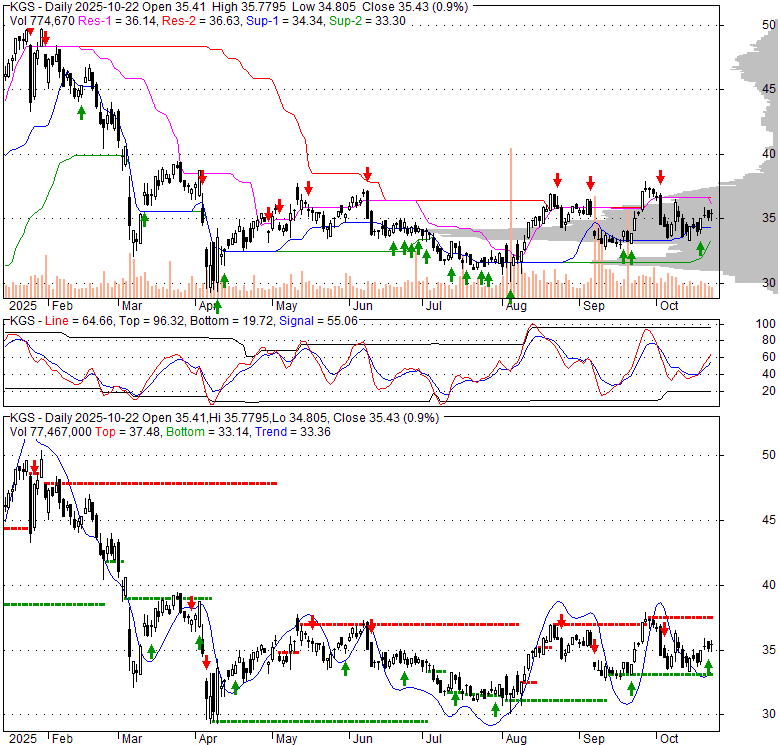 Price has closed above its short-term moving average. Short-term moving average is currently above mid-term; and above long-term moving average. From the relationship between price and moving averages: This stock is BULLISH in short-term; and BULLISH in mid-long term.[ KGS ] has closed below upper band by 21.9%. Bollinger Bands are 29.6% narrower than normal. The current width of the bands does not suggest anything about the future direction or movement of prices.