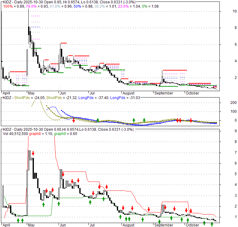 Price has closed below its short-term moving average. Short-term moving average is currently below mid-term; and below long-term moving average. From the relationship between price and moving averages: This stock is BEARISH in short-term; and BEARISH in mid-long term.[ KIDZ ] has closed above bottom band by 4.2%. Bollinger Bands are 64.2% narrower than normal. The narrow width of the bands suggests low volatility as compared to its normal range. The bands have been in this narrow range for {EMPTY} bars. This is a sign that the market may be about to initiate a new trend.