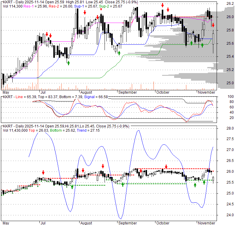 Price has closed below its short-term moving average. Short-term moving average is currently above mid-term; and above long-term moving average. From the relationship between price and moving averages: This stock is NEUTRAL in short-term; and BULLISH in mid-long term.[ KKRT ] has closed above bottom band by 40.2%. Bollinger Bands are 11.6% wider than normal. The current width of the bands does not suggest anything about the future direction or movement of prices.
