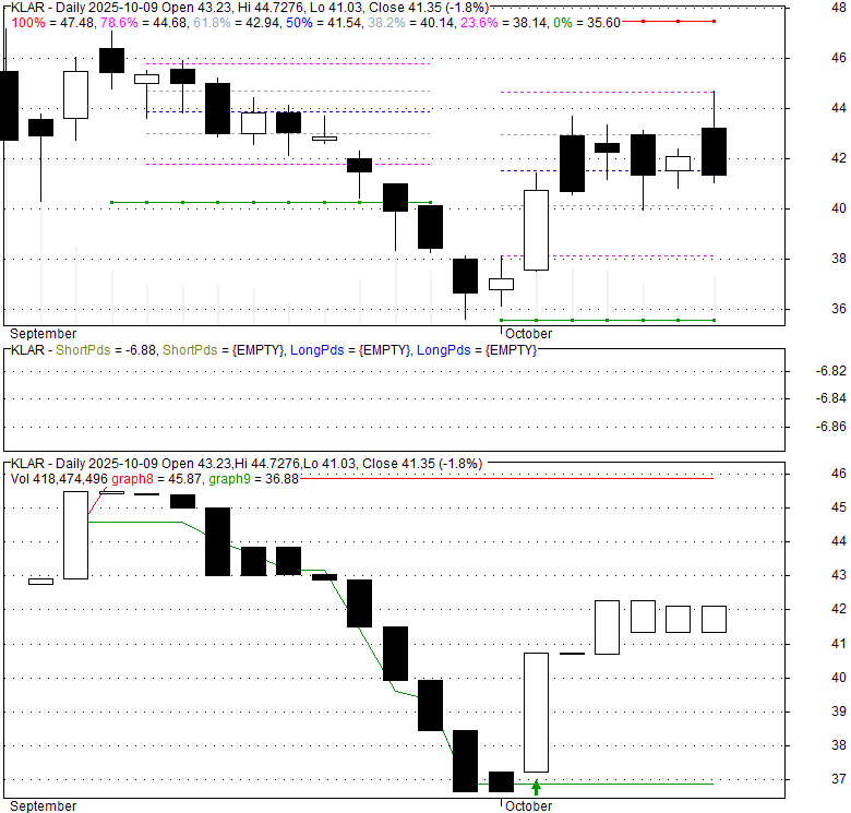 Price has closed above its short-term moving average. Short-term moving average is currently below mid-term; and below long-term moving average. From the relationship between price and moving averages: This stock is NEUTRAL in short-term; and NEUTRAL in mid-long term.[ KLAR ] has closed below upper band by 40.3%. Bollinger Bands are 0% narrower than normal.