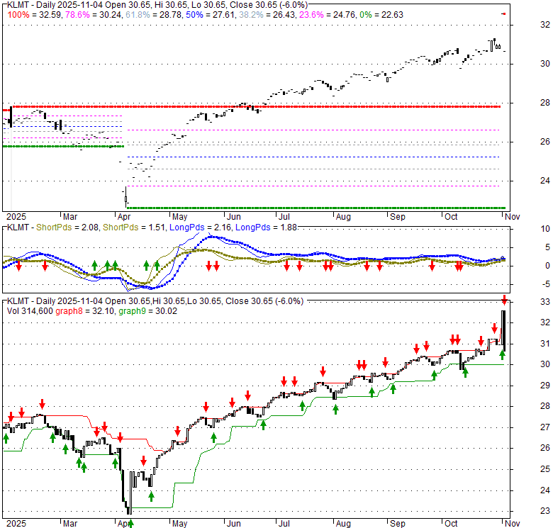 Price has closed below its short-term moving average. Short-term moving average is currently above mid-term; and above long-term moving average. From the relationship between price and moving averages: This stock is NEUTRAL in short-term; and BULLISH in mid-long term.[ KLMT ] has closed above bottom band by 39.9%. Bollinger Bands are 116.5% wider than normal. The large width of the bands suggest high volatility as compared to its normal range. The bands have been in this wide range for 5 days. This is a sign that the current trend might continue.