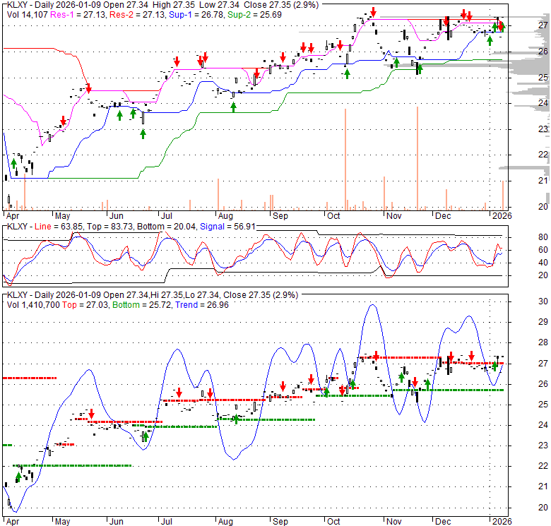 Price has closed above its short-term moving average. Short-term moving average is currently above mid-term; and above long-term moving average. From the relationship between price and moving averages: This stock is BULLISH in short-term; and BULLISH in mid-long term.[ KLXY ] has closed below upper band by 5.6%. Bollinger Bands are 39.2% narrower than normal. The current width of the bands does not suggest anything about the future direction or movement of prices.