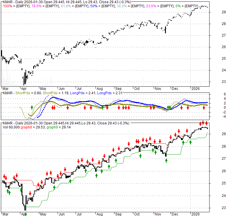Price has closed below its short-term moving average. Short-term moving average is currently above mid-term; and above long-term moving average. From the relationship between price and moving averages: This stock is NEUTRAL in short-term; and BULLISH in mid-long term.[ KMAR ] has closed above bottom band by 41.9%. Bollinger Bands are 58.5% narrower than normal. The narrow width of the bands suggests low volatility as compared to its normal range. The bands have been in this narrow range for 1 bars. This is a sign that the market may be about to initiate a new trend.