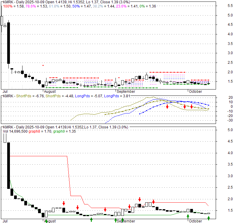 Price has closed below its short-term moving average. Short-term moving average is currently below mid-term; and below long-term moving average. From the relationship between price and moving averages: This stock is BEARISH in short-term; and NEUTRAL in mid-long term.[ KMRK ] has closed above bottom band by 20.3%. Bollinger Bands are 0% narrower than normal.