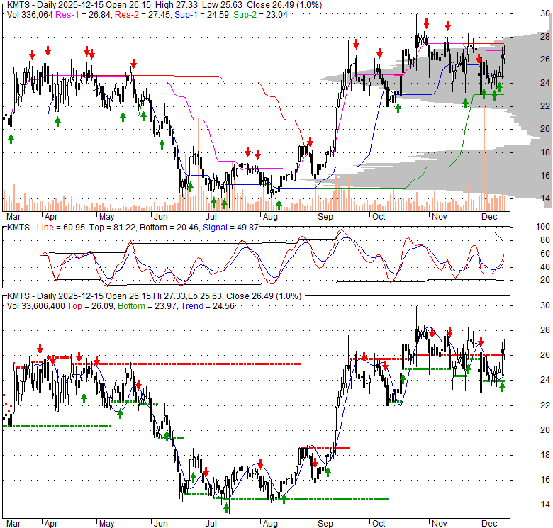 Price has closed above its short-term moving average. Short-term moving average is currently below mid-term; and above long-term moving average. From the relationship between price and moving averages: This stock is NEUTRAL in short-term; and NEUTRAL in mid-long term.[ KMTS ] has closed below upper band by 24.3%. Bollinger Bands are 5.8% wider than normal. The current width of the bands does not suggest anything about the future direction or movement of prices.