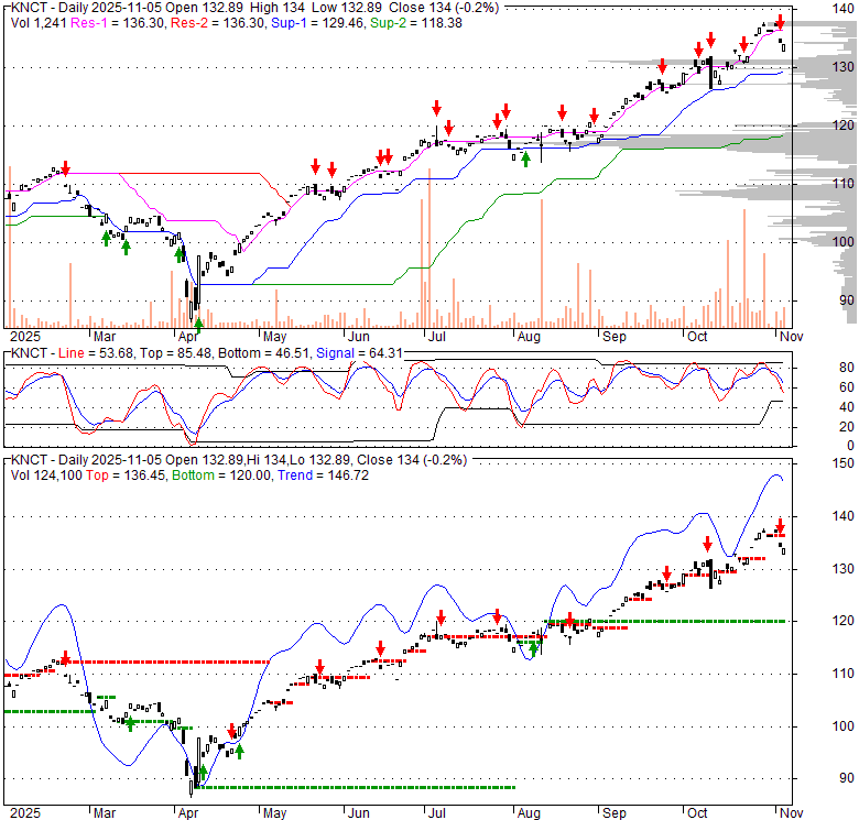 Price has closed below its short-term moving average. Short-term moving average is currently above mid-term; and above long-term moving average. From the relationship between price and moving averages: This stock is NEUTRAL in short-term; and BULLISH in mid-long term.[ KNCT ] has closed below upper band by 49.8%. Bollinger Bands are 48.5% wider than normal. The large width of the bands suggest high volatility as compared to its normal range. The bands have been in this wide range for 7 days. This is a sign that the current trend might continue.