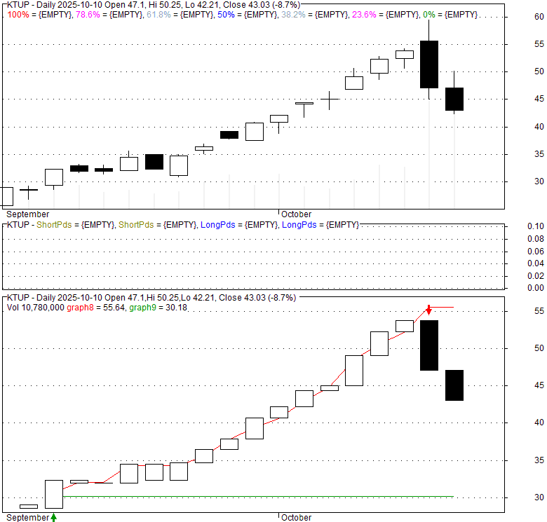 Price has closed below its short-term moving average. Short-term moving average is currently below mid-term; and below long-term moving average. From the relationship between price and moving averages: This stock is NEUTRAL in short-term; and NEUTRAL in mid-long term.[ KTUP ] has closed below upper band by 45.1%. Bollinger Bands are 0% narrower than normal.