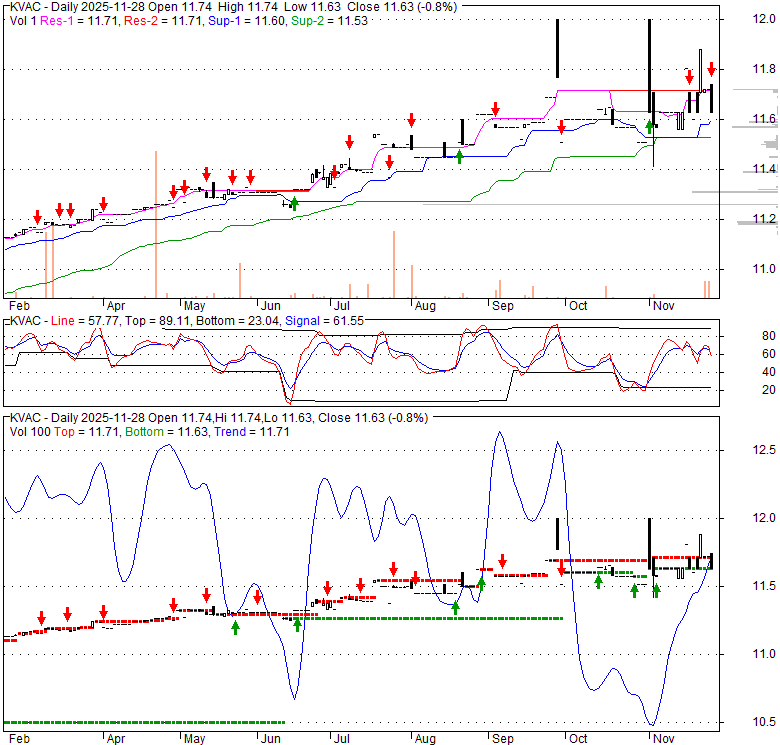 Price has closed below its short-term moving average. Short-term moving average is currently above mid-term; and above long-term moving average. From the relationship between price and moving averages: This stock is NEUTRAL in short-term; and BULLISH in mid-long term.[ KVAC ] has closed above bottom band by 38.3%. Bollinger Bands are 69.9% wider than normal. The large width of the bands suggest high volatility as compared to its normal range. The bands have been in this wide range for 3 days. This is a sign that the current trend might continue.