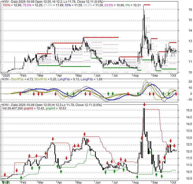 Price has closed above its short-term moving average. Short-term moving average is currently above mid-term; and above long-term moving average. From the relationship between price and moving averages: This stock is BULLISH in short-term; and BULLISH in mid-long term.[ KYIV ] has closed below upper band by 38.1%. Bollinger Bands are 30.7% narrower than normal. The current width of the bands does not suggest anything about the future direction or movement of prices.