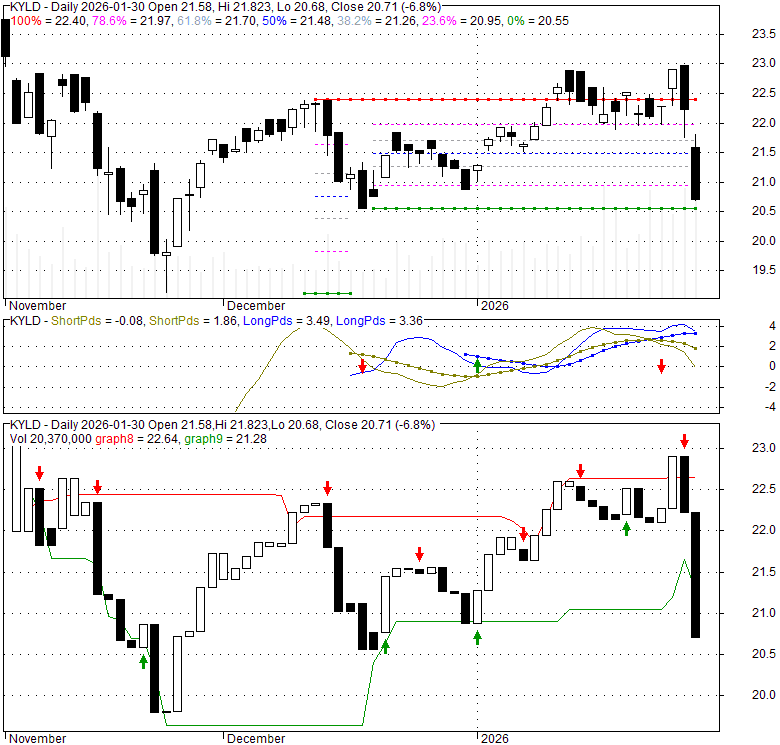 Price has closed below its short-term moving average. Short-term moving average is currently above mid-term; and below long-term moving average. From the relationship between price and moving averages: This stock is NEUTRAL in short-term; and NEUTRAL in mid-long term.[ KYLD ] has closed below the lower bollinger band by 31.4%. Bollinger Bands are 0% narrower than normal.