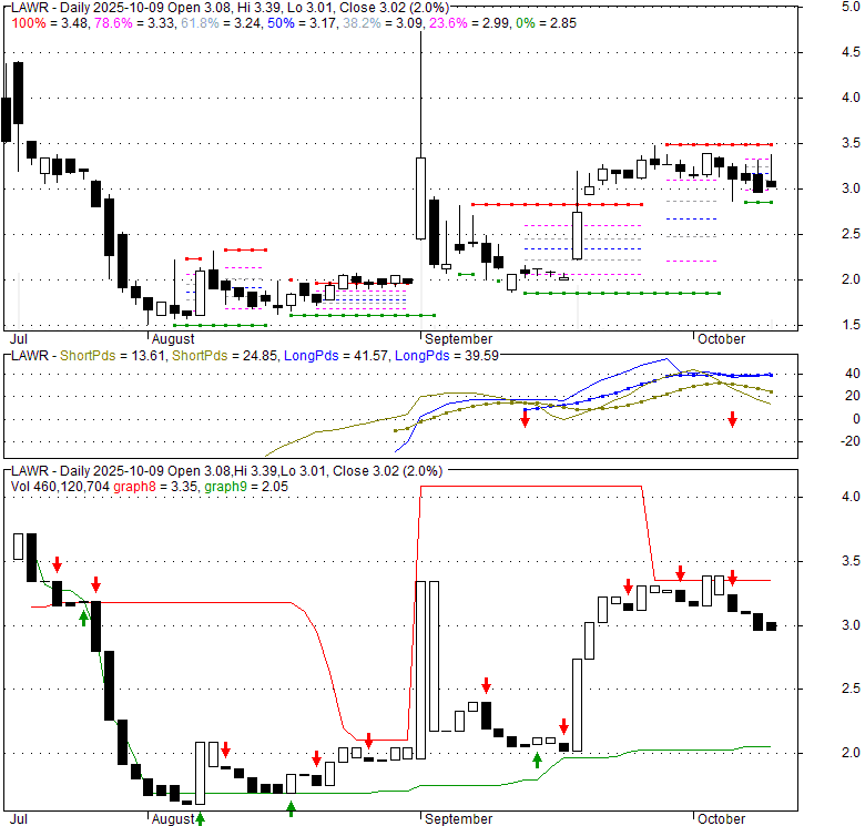 Price has closed below its short-term moving average. Short-term moving average is currently above mid-term; and below long-term moving average. From the relationship between price and moving averages: This stock is NEUTRAL in short-term; and NEUTRAL in mid-long term.[ LAWR ] has closed above bottom band by 23.2%. Bollinger Bands are 0% narrower than normal.
