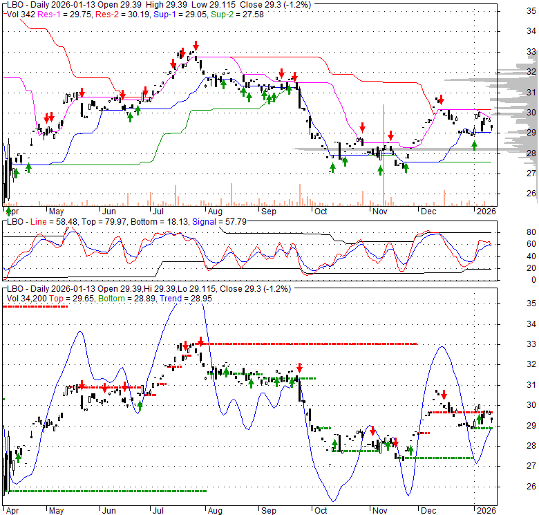 Price has closed below its short-term moving average. Short-term moving average is currently above mid-term; and above long-term moving average. From the relationship between price and moving averages: This stock is NEUTRAL in short-term; and NEUTRAL in mid-long term.[ LBO ] has closed above bottom band by 45.9%. Bollinger Bands are 21.8% narrower than normal. The current width of the bands does not suggest anything about the future direction or movement of prices.