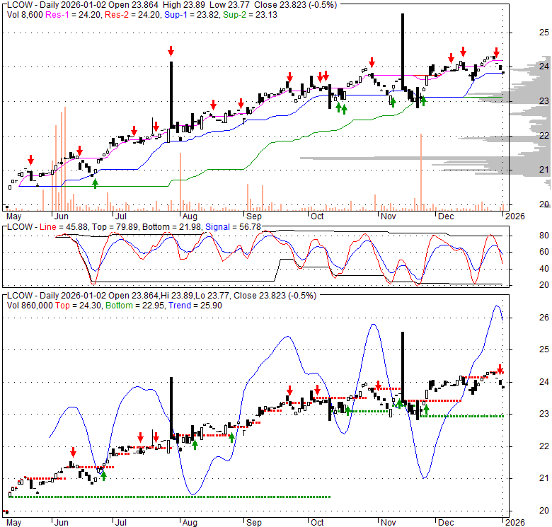 Price has closed below its short-term moving average. Short-term moving average is currently above mid-term; and above long-term moving average. From the relationship between price and moving averages: This stock is NEUTRAL in short-term; and BULLISH in mid-long term.[ LCOW ] has closed above bottom band by 28.7%. Bollinger Bands are 1.6% wider than normal. The current width of the bands does not suggest anything about the future direction or movement of prices.