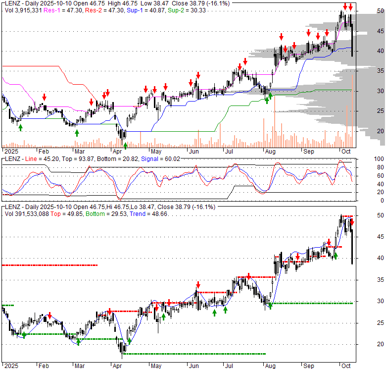 Price has closed below its short-term moving average. Short-term moving average is currently above mid-term; and above long-term moving average. From the relationship between price and moving averages: This stock is NEUTRAL in short-term; and BULLISH in mid-long term.[ LENZ ] has closed above bottom band by 8.3%. Bollinger Bands are 112.9% wider than normal. The large width of the bands suggest high volatility as compared to its normal range. The bands have been in this wide range for 7 days. This is a sign that the current trend might continue.